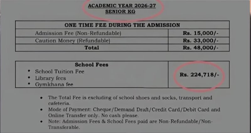 According to the details, parents enrolling their child in kindergarten must also pay a one-time admission charge of ₹48,000. This includes a non-refundable admission fee of ₹15,000 and a refundable caution deposit of ₹33,000.