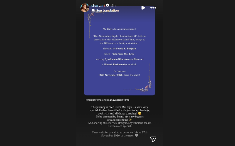 Backed by Rajshri Productions in association with Mahaveer Jain Films, the project also marks a key addition to Sharvari’s growing film slate, which includes multiple large-scale theatrical releases.