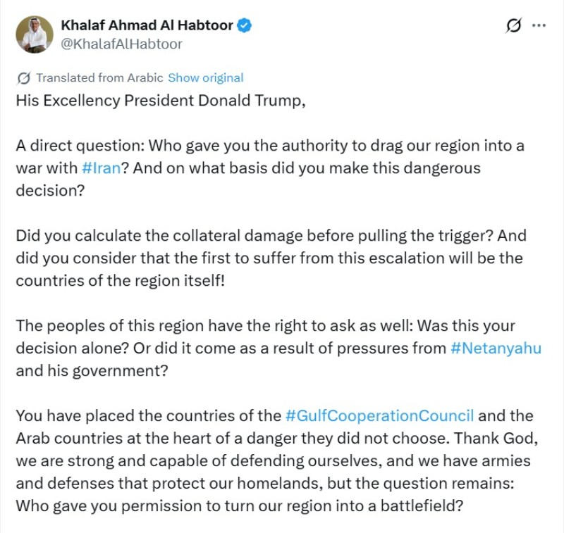 The founder of the Dubai-based Al Habtoor Group published the message in Arabic on the social media platform X, raising pointed questions about the motivations and authority behind the military action.